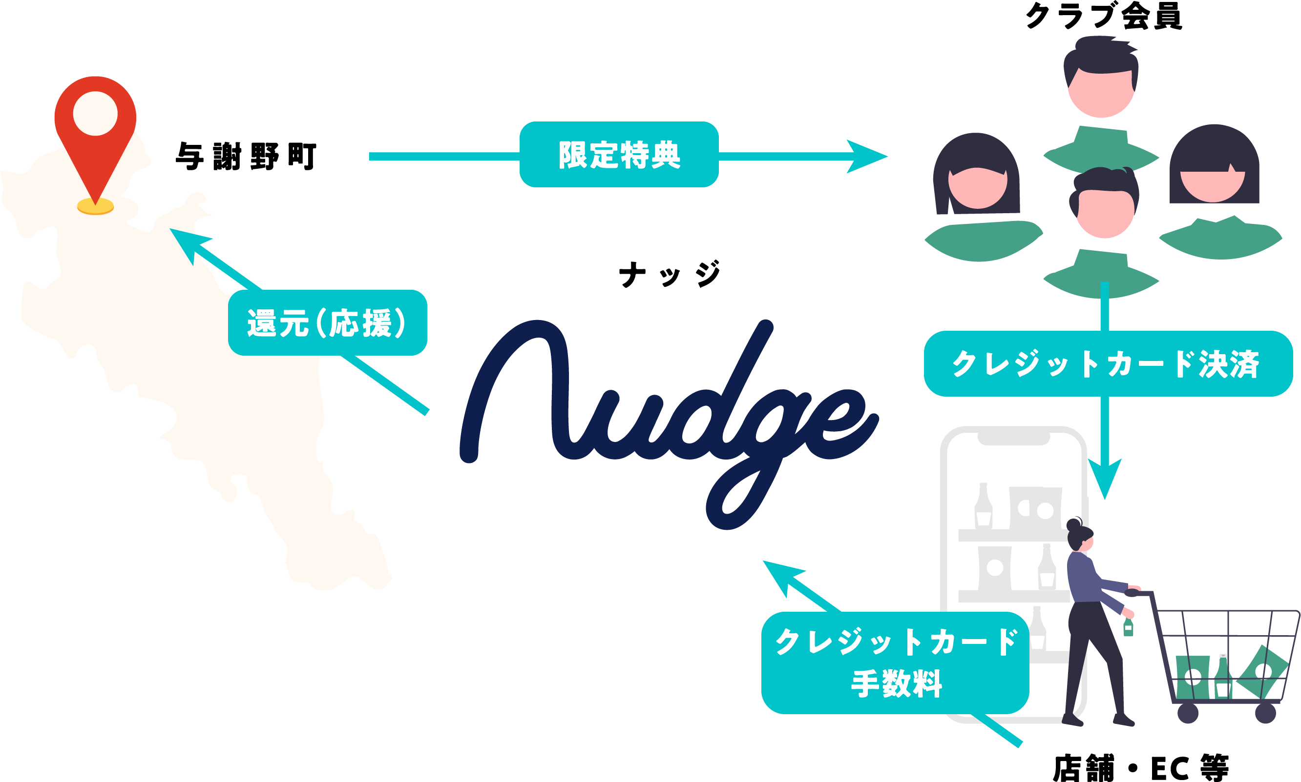 次世代クレジットカード「ナッジ」は、利用金額の一部がクラブに還元される仕組みを、企業や個人、自治体、社会貢献団体で広く活用いただいています。「与謝野町ファンクラブ」をはじめ、今後もカード利用で「推し」を応援できるクラブの充実と、さらなるサービスの利便性向上に努めてまいります。